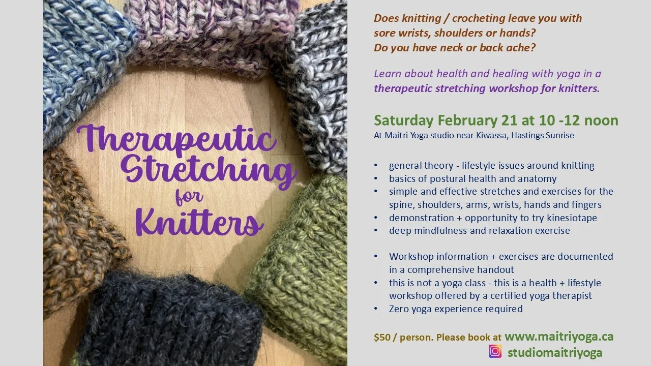 YOGA FOR KNITTERS - this special session focuses on health for spine, hands and wrists. Exercise and lifestyle handout provided.